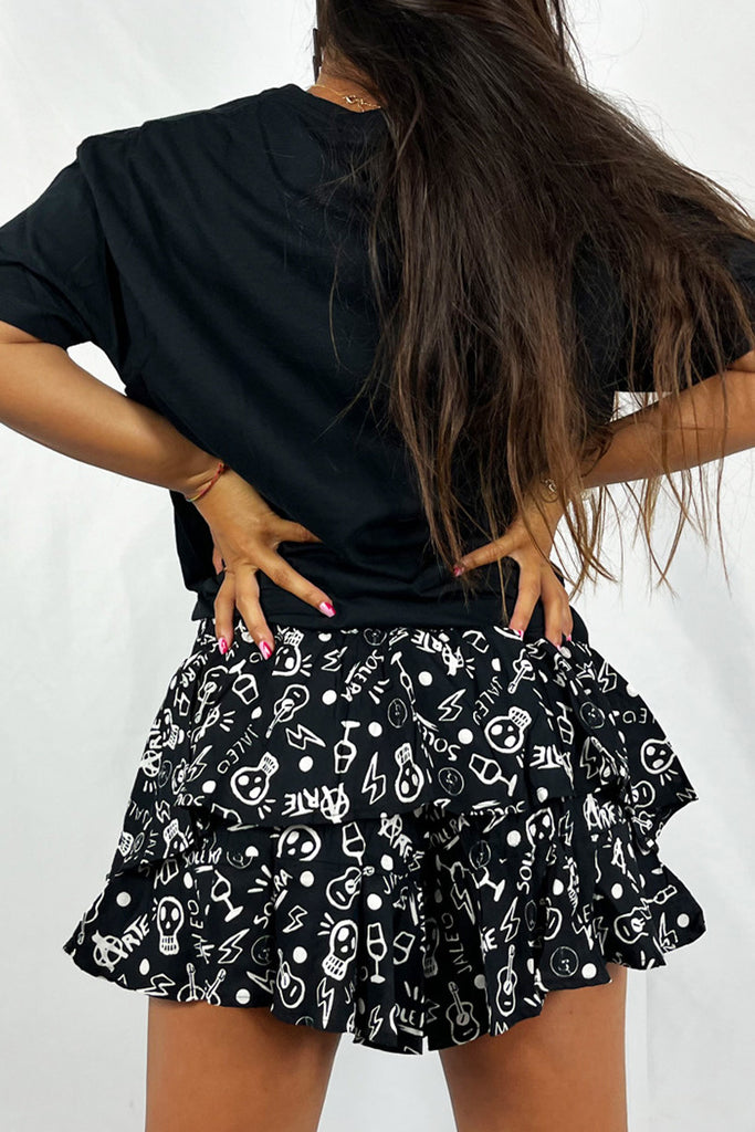 Minifalda pantalón con estampado motivos jaleo, volantes y elástico ajustable en la cintura.