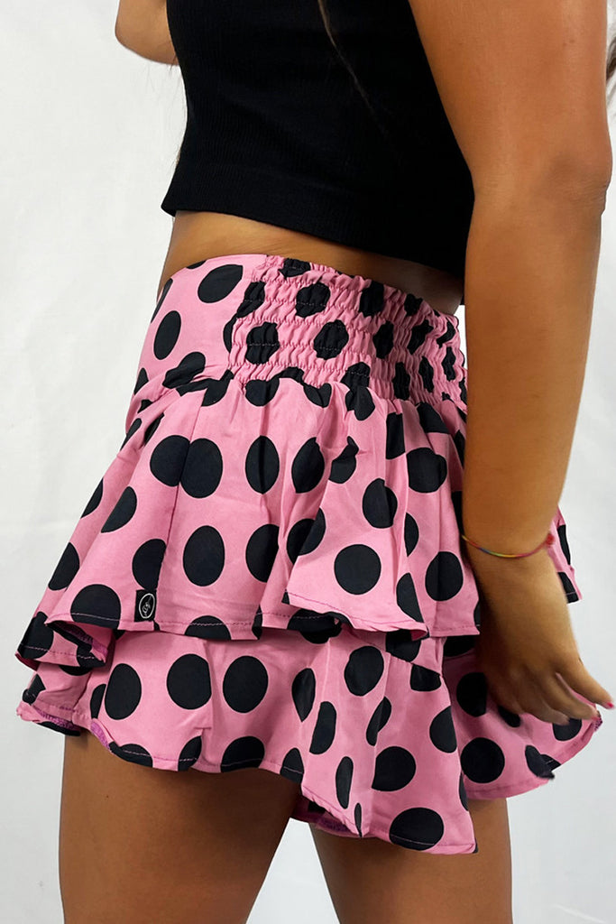 Minifalda pantalón con estampado de lunares negros y rosa, volantes y elástico ajustable en la cintura.