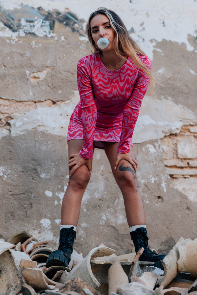 Un vestido 100% creativo, 100% Jaleo. Corto, de cuello redondo y ajustado al cuerpo, con un estampado psicodelico en tonos rosas que no dejará indiferente a nadie.